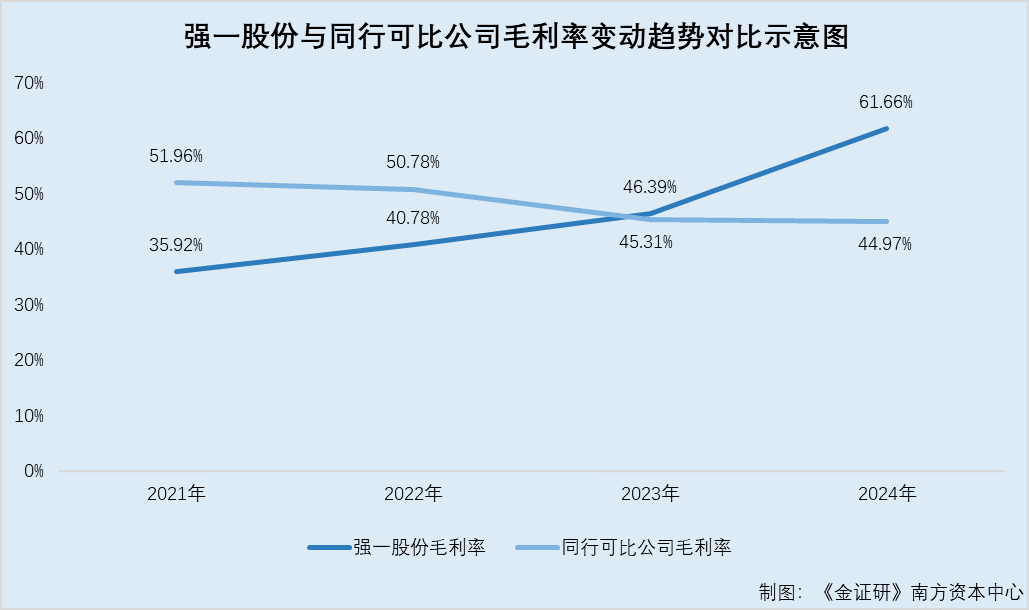 显然,2021-2024年,强一股份的毛利率持续走高,变动趋势异于同行。到了2025年上半年,强一股份的毛利率仍高于同行均值。