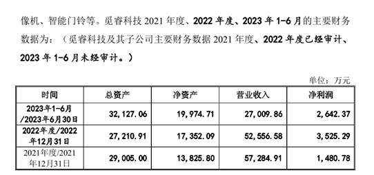 而觅睿科技本次申报信息中关于其2021年、2022年的主要财务数据显示,2021-2022年,觅瑞科技的营收分别为5.51亿元、5.49亿元,净利润分别为0.03亿元、0.39亿元;同期期末,觅睿科技的总资产分别为2.8亿元、2.62亿元,净资产分别为1.29亿元、1.6亿元。