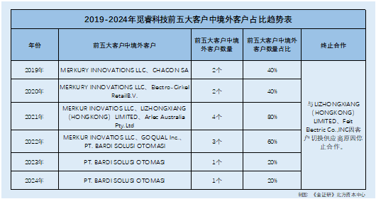 换言之,觅睿科技称其中短期仍聚焦海外市场,而2022-2024年境外收入占比下滑,且2023-2024年,觅睿科技前五大客户中境外客户数量下滑至一家。此外,两家主要境外客户与觅睿科技终止合作。