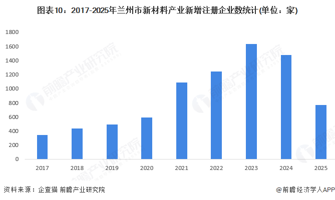 企查猫数据显示,2017-2023年,兰州市新材料业企业注册数量呈现上升趋势,2024年达到1473家,较2023年同比减少9.5%。2025年截至8月1日,新增注册企业数量超过700家。