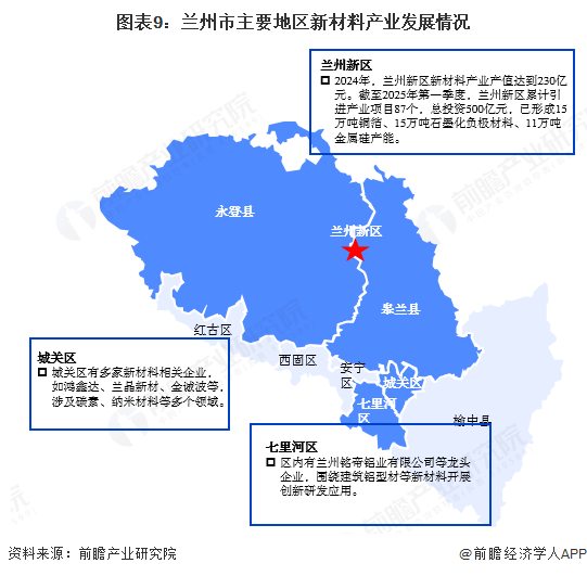 2024年,兰州新区的新材料产值规模已经达到230元。2025年以来,兰州新区引入年产8万吨碳基新材料等项目,新材料产业逐渐发展壮大。城关区和七里河区也培育或引入了一批新材料企业,城关区拥有鸿鑫达等企业,七里河区拥有铭帝铝业等企业。