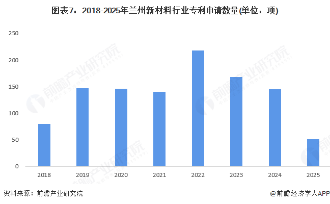 2018-2025年,兰州市新材料领域专利申请量波动变化,2022年超过200项,2023年超过150项,2024年为145项。