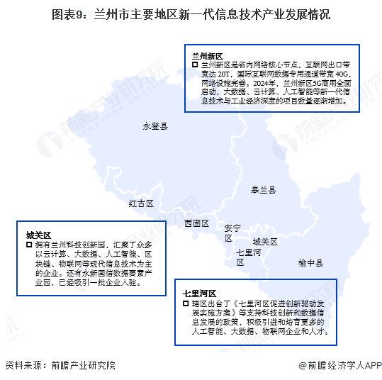 兰州市城关区已经建有较多的新一代信息技术产业园,包括兰州科技创新园、永新国信数据要素产业园,已经吸引一批企业入驻,产业集群初具规模。七里河区出台了一系列政策,正在积极推动人工智能、大数据、物联网等领域的企业和人才。兰州新区加强信息基础设施建设,推动新一代信息技术在工业等领域的深度融合。