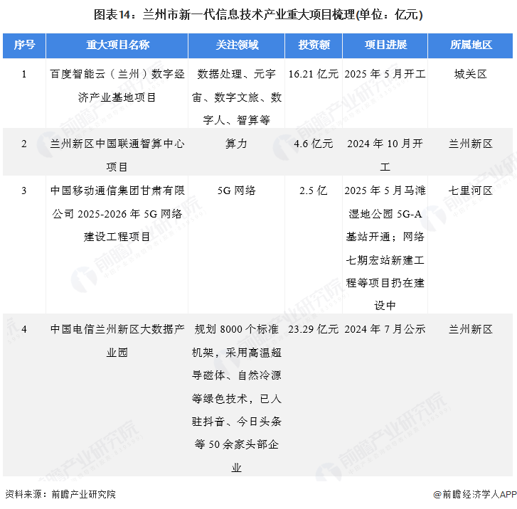 目前,兰州新一代信息技术领域重点项目主要包括百度智能云(兰州)数字经济产业基地项目、兰州新区中国联通智算中心项目、中国移动通信集团甘肃有限公司2025-2026年5G网络建设工程项目及等,涉及领域包括数据处理、算力、5G网络等方面,主要项目信息汇总如下: