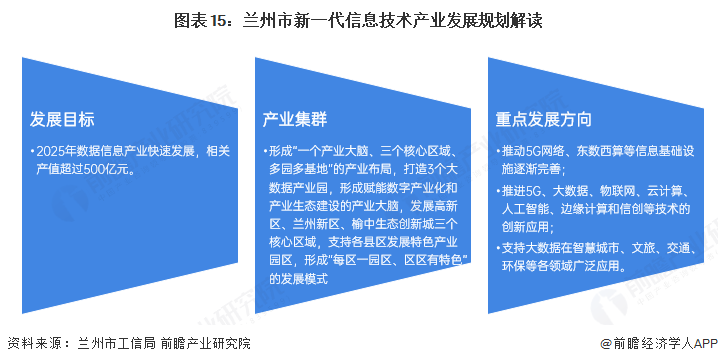 根据《兰州市“十四五”信息技术和大数据产业发展规划》的规划,到2025年兰州市数据信息产业产值超过500亿元,形成“一个产业大脑、三个核心区域、多园多基地”的产业布局,完善5G网络、东数西算等信息基础设施,加快5G、大数据、物联网、云计算、人工智能、边缘计算和信创等技术的创新应用。