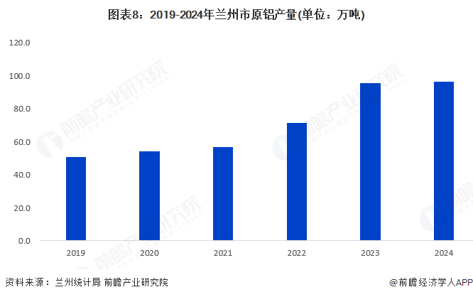 铝是兰州市有色冶金行业重点金属产品,兰州统计局数据显示,2019年以来,兰州市原铝产量呈现上升趋势,2023年和2024年兰州市原铝产量维持在95万吨以上,较以前年度大幅增长。