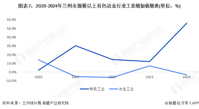 2020-2024年,兰州市冶金工业规模以上企业工业增加值增速波动变化,有色工业规模以上企业工业增加值增速均大于0,2024年增速达到56%,呈现快速增长趋势。