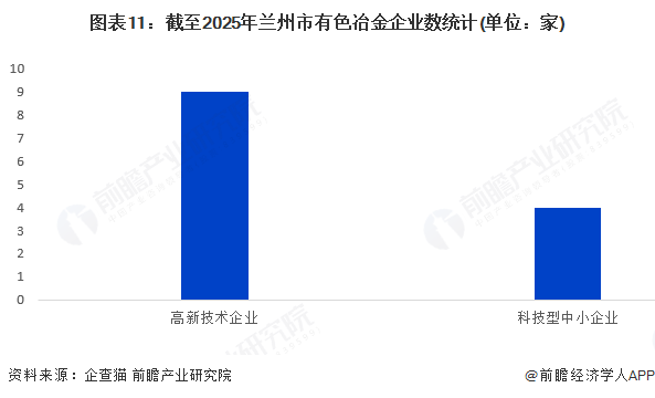 截至2025年6月,兰州市有色冶金行业拥有9家高新技术企业,4家科技型中小企业。高新技术企业代表性企业有兰州有色冶金设计研究院有限公司、兰州铝业有限公司等。