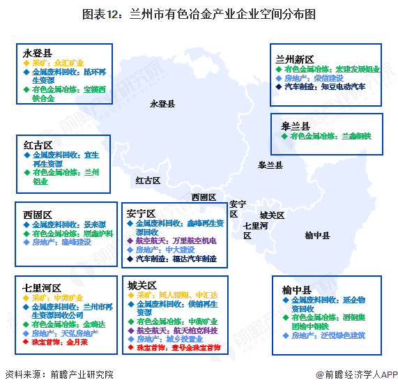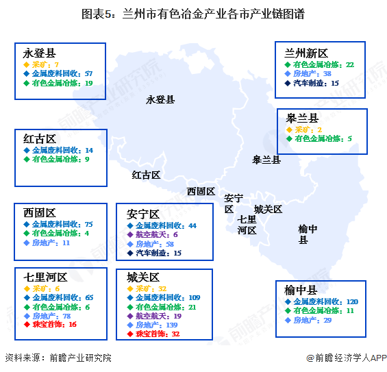 目前,兰州市采矿企业主要分布在城关区、永登县、七里河区等;金属废料回收企业分布在城关区、榆中县、西固区等;有色金属冶炼企业分布在兰州新区、城关区、永登县等;下游航空航天、汽车制造企业主要分布在兰州新区、安宁区、城关区、七里河区。