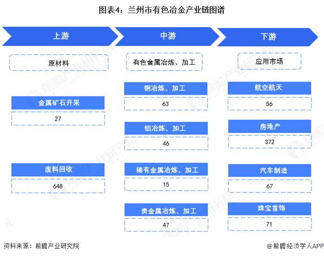 目前,兰州市有色冶金产业链较为完善,上游金属矿石开采企业超过20家,废料回收企业数量较多,超过600家;中游铜、铝冶炼加工及贵金属冶炼加工企业较多;下游房地产企业超过300家,航空航天企业达到56家,汽车制造和珠宝首饰企业均在60家以上。