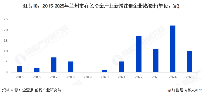 企查猫数据显示,2017年以来,兰州市有色冶金业企业注册数量呈现波动上升趋势,2024年达到22家,较2023年增加家11家。截至6月11日,2025年兰州市有色冶金企业注册数量已经达到10家。