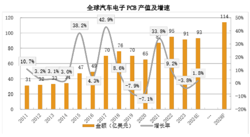 与此同时,下游客户需求正持续爆发。据中国汽车工业协会数据,2024年国内新能源汽车渗透率已达42.1%,较2020年的5.4%增长近7倍;而全球新能源汽车渗透率也突破25%,预计2027年将攀升至40%以上。随着新能源汽车的销量增长和渗透率提高,对汽车电子PCB的需求量亦不断提升。根据Prismark预测,2024年至2028年全球汽车电子PCB产值年均复合增长率为5.1%,保持较高增速。