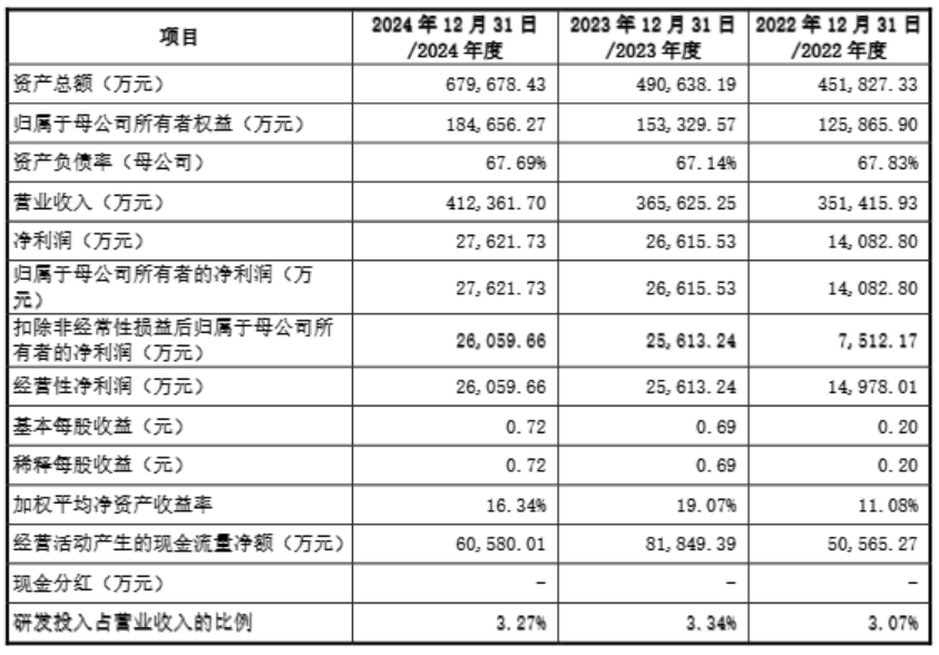 从财务表现上看,超颖电子近些年营收与利润规模持续稳健增长。2022至2024年期间,公司分别实现营业收入351,415.93万元、365,625.25万元及412,361.70万元;同期归属于母净利润分别为14,082.80万元、26,615.53万元及27,621.73万元,年化复合增速超40%。