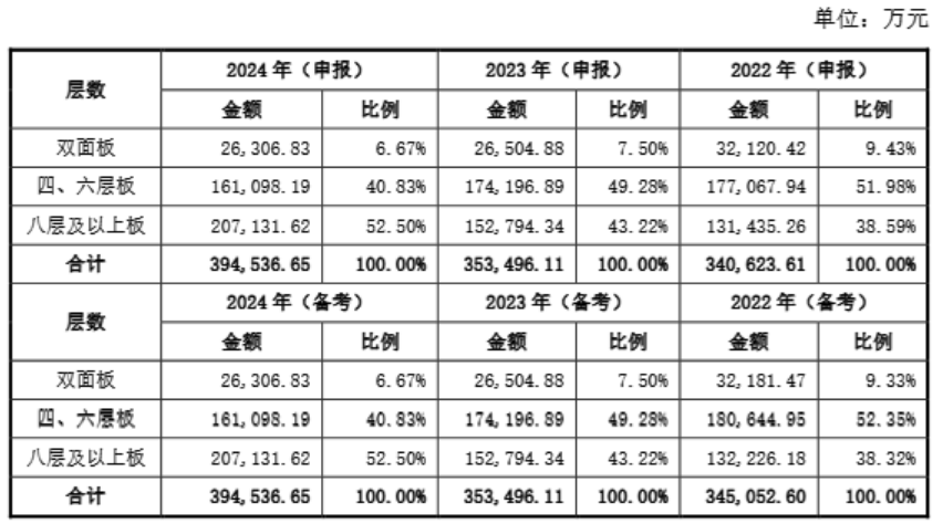 超颖电子的主营业务收入主要来自四层、六层及八层及以上印制电路板(PCB),2024年占比合计达93.33%。其中,公司八层及以上PCB的收入占比正持续攀升,成为驱动其营收结构优化的关键力量。