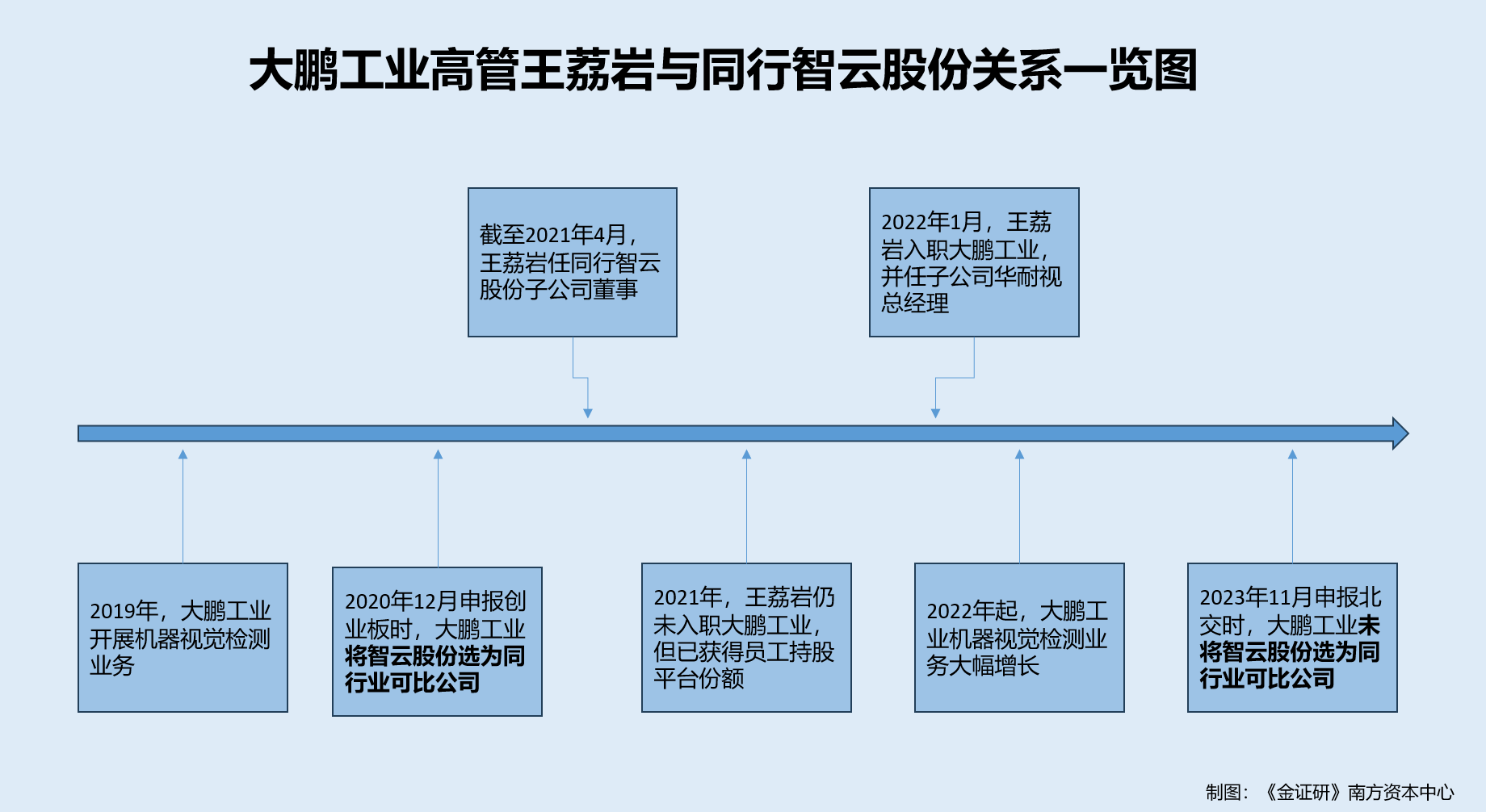 在此背景下,关于王荔岩的任职履历或值得关注。王荔岩曾于同行智云股份处任副总经理。截至2021年4月,王荔岩彼时仍任智云股份子公司董事。大鹏工业曾于2020年12月申报创业板。前次申报中,大鹏工业将智云股份认定为同行业可比公司之一,然而此次于北交所申报,大鹏工业却未选取智云股份作为可比公司。于此,北交所问及大鹏工业本次申报与前次申报可比公司存在较大差异的原因。基于上述情形,大鹏工业子公司华耐视主要从事机器视觉检测设备业务。作为华耐视总经理,王荔岩入职当年即2022年,大鹏工业的机器视觉检测设备业务收入大幅增长。公开信息显示,智云股份设备均应用视觉相关技术,并且较为成熟。