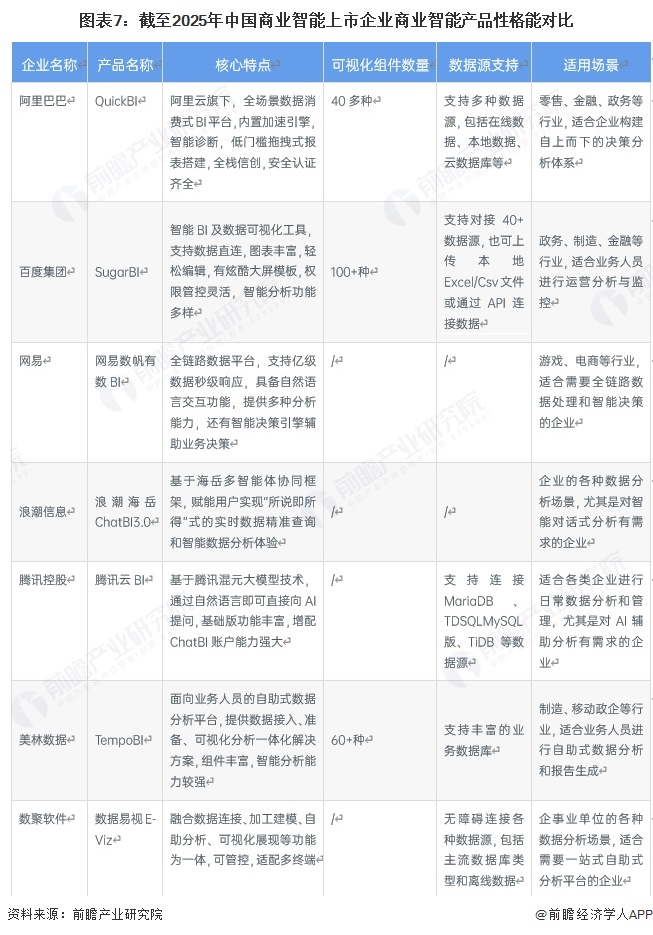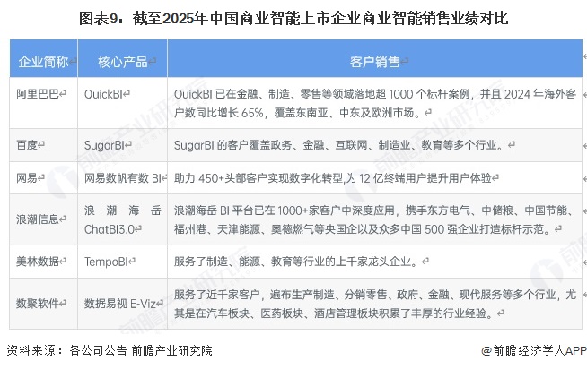 阿里巴巴QuickBI、百度SugarBI、网易数帆有数BI、浪潮信息浪潮海岳ChatBI3.0、美林数据TempoBI、数聚软件数据易视E-Viz,核心产品分别覆盖金融、政务、头部企业、央国企、龙头企业及多行业客户,且在海外市场、汽车医药等细分领域各有突破。