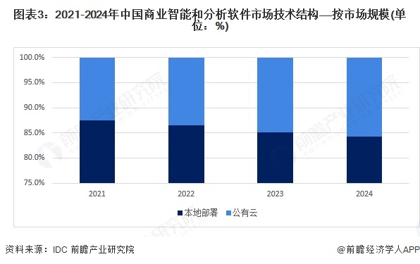2021-2024年中国商业智能和分析软件市场细分技术结构中,本地部署类占比从2021年的87.5%下降至84.3%,公有云占比从12.5%上升至15.7%。