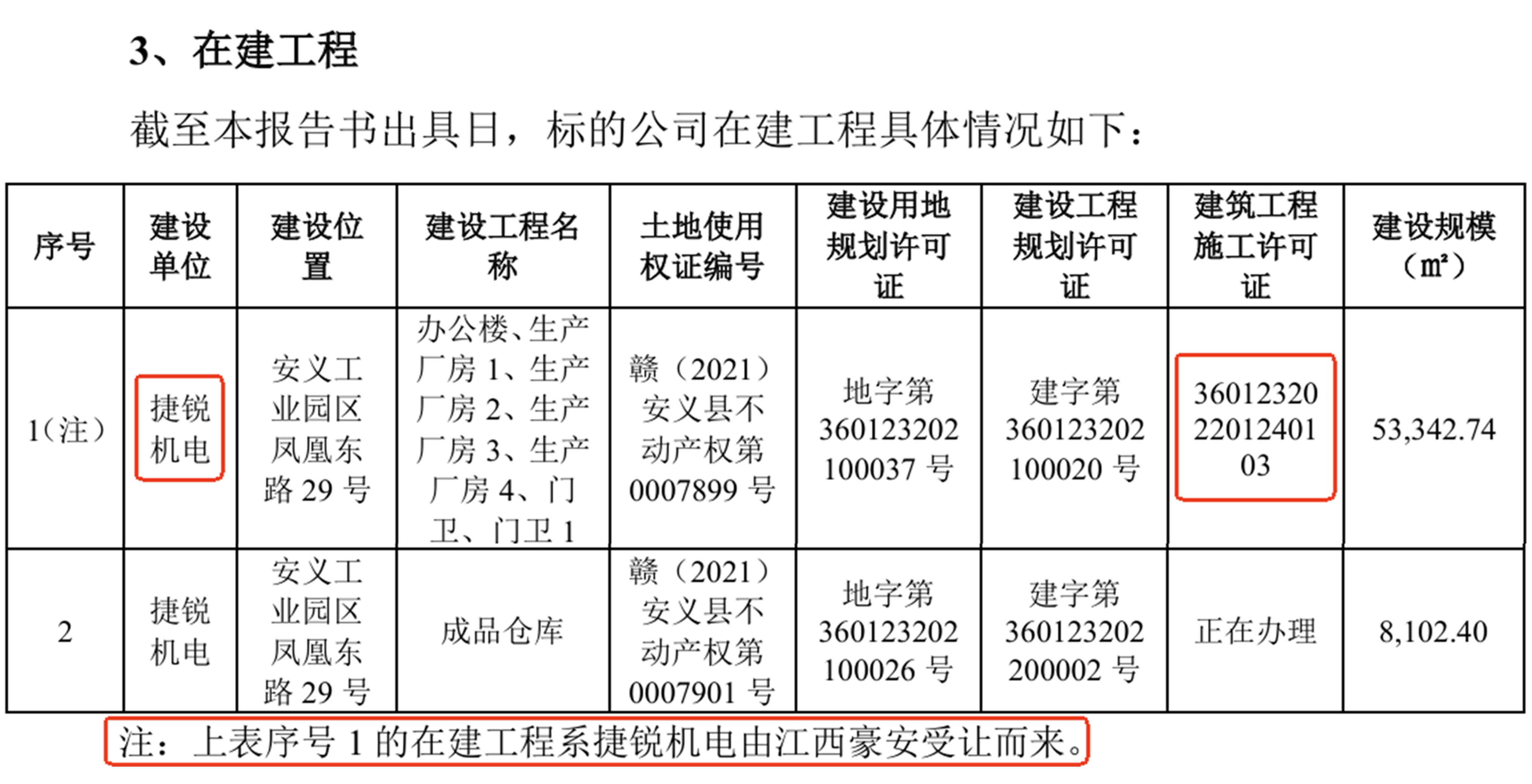 据*ST沐邦出具日为2022年4月15日的公告,截至2022年4月15日,内蒙古豪安的在建工程中,包括捷锐机电建设的“办公楼、生产厂房1、生产厂房2、生产厂房3、生产厂房4、门卫、门卫1”(以下简称“捷锐机电序号1工程”)、“成品仓库”,建设位置均为安义工业园区凤凰东路29号,建设规模合计为61,445.14㎡。其中,捷锐机电序号1工程系捷锐机电自江西豪安受让而来。