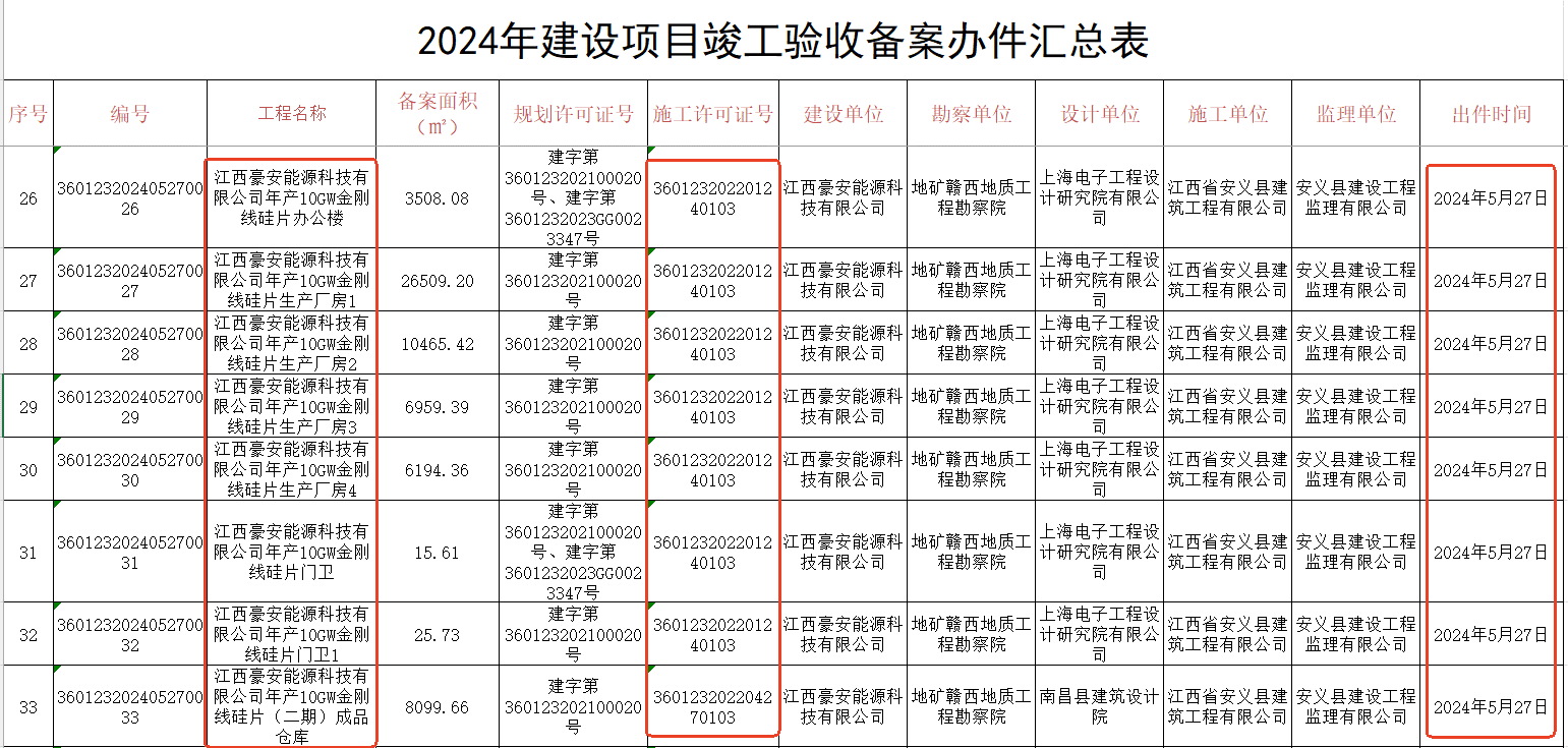 同时,据安义县住建局于2025年2月17日发布的《2024年建设项目竣工验收备案办件汇总表》,施工许可证号为360123202201240103、建设单位为江西豪安,对应包括工程名称为“江西豪安能源科技有限公司年产10GW金刚线硅片办公楼”、“江西豪安能源科技有限公司年产10GW金刚线硅片生产厂房1”等8项工程,出件时间为2024年5月27日。