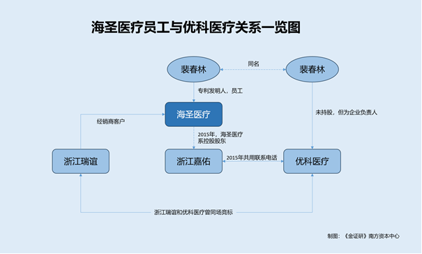 另外,至少在2010年3月至2024年6月,海圣医疗专利发明人包括裴春林。而同名的“裴春林”,系优科医疗的企业负责人。需要指出的是,优科医疗曾中标的产品与海圣医疗部分产品或存重合,且优科医疗曾与海圣医疗彼时控股的企业共用联系方式。此外,优科医疗与海圣医疗客户浙江瑞谊存在同场竞标情况。