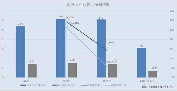 2023-2024年,海圣医疗营业收入的同比增长率分别为14.25%、-0.7%;同期,净利润的同比增长率分别为11.31%、-9.12%。