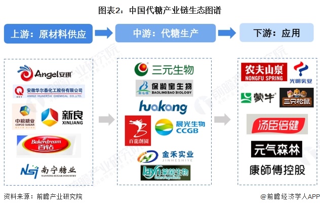 代糖上游原材料供应商主要包括安琪酵母、白钻、新良、华尔泰等企业;中游代糖生产企业主要三元生物、保龄宝、华康股份、百龙创园、晨光生物、金禾实业、莱茵生物等;下游应用领域的代表性企业有农夫山泉、光明、蒙牛、元气森林食品饮料企业,汤臣倍健保健品企业等。