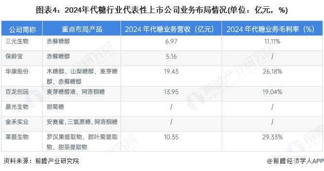 2024年中国代糖行业中,华康股份、莱茵生物等企业营收较为领先。从毛利率水平看,华康股份代糖产品毛利率在29%左右,华康股份在28%左右。从产品布局看,布局糖醇类产品以及天然代糖产品的企业数量较多。