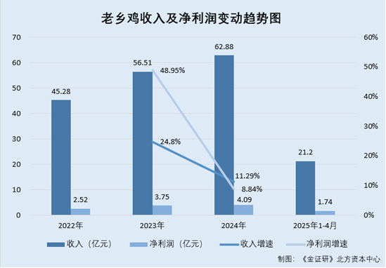 据老乡鸡最后实际可行日期为2025年6月30日的招股书(以下简称“2025年6月30日招股书”)(以下简称“2025年6月30日招股书”),2022-2024年及2025年1-4月,老乡鸡的营业收入分别为45.28亿元、56.51亿元、62.88亿元、21.2亿元,净利润分别为2.52亿元、3.75亿元、4.09亿元、1.74亿元。