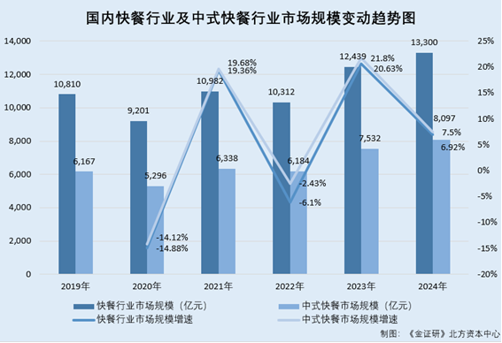 经测算,2020-2024年,国内快餐行业市场规模增速分别为-14.88%、19.36%、-6.1%、20.63%、6.92%。同期,国内中式快餐行业市场规模增速分别为-14.12%、19.68%、-2.43%、21.8%、7.5%。