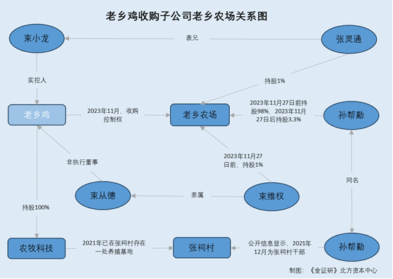 上述可知,老乡农场成立于2022年3月,彼时,孙帮勤、老乡鸡实控人之一束小龙表兄张灵通、老乡鸡非执行董事束从德的亲属束维权分别持股98%、1%、1%。2023年11月,老乡农场变更股权后,孙帮勤、张灵通、老乡鸡子公司安徽老乡鸡分别持股3.3%、1%、95.7%,自此,老乡农场成为老乡鸡的子公司。