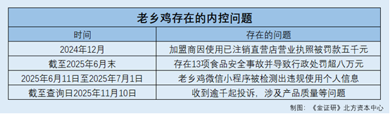 在招股书中,老乡鸡表示,其已实施一套全面的系统来监督加盟商的日常运营,确保严格遵守质量控制、食品安全及运营标准。此方面,截至2025年6月末存在多项食品安全事故并导致行政处罚,原因包括使用超过保质期的食材等。此外,老乡鸡消费和服务平收到逾千起投诉、老乡鸡微信小程序曾被检测出违规使用个人信息等情形,或也值得关注。