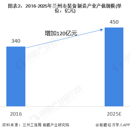 2016年兰州全市装备制造业完成工业产值340亿元,占全市规模以上工业比重为10.28%。根据兰州市工业和信息化局数据,2025年兰州市装备制造业工业产值将达到450亿元。