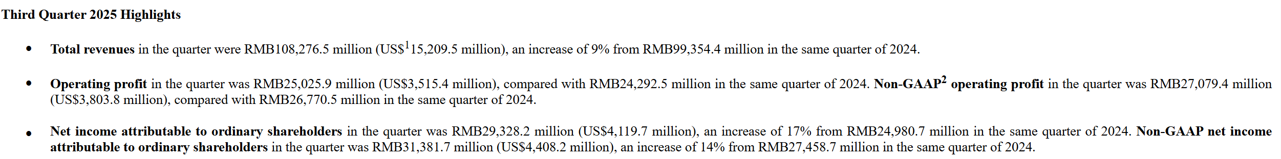 11月18日晚间美股开盘前,拼多多公布2025年第三季度业绩:2025Q3拼多多实现营业收入152.09亿美元,同比2024Q3增长约9%;实现归母净利润41.20亿美元,同比增长约17%,实现Non-GAAP净利润44.08亿美元,同比增长约14%。