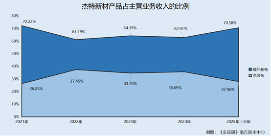 2021-2024年及2025年上半年,玻纤基布产品收入占杰特新材主营业务收入的比例分别为72.22%、61.19%、64.19%、62.91%、70.58%;涂层布占主营业务收入的比例分别为26.28%、37.45%、34.7%、35.69%、27.96%。