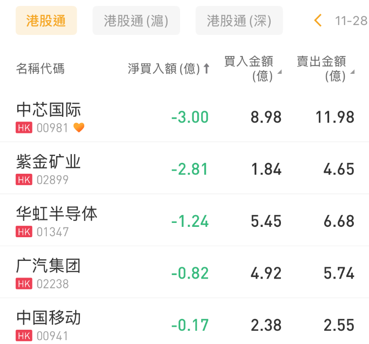 中芯国际、紫金矿业、华虹半导体分别遭净卖出3亿港元、2.81亿港元、1.24亿港元。