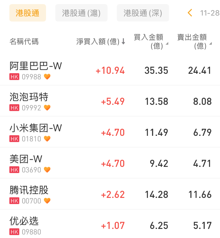 阿里巴巴-W、泡泡玛特、小米集团-W分别获净买入10.94亿港元、5.49亿港元、4.7亿港元。