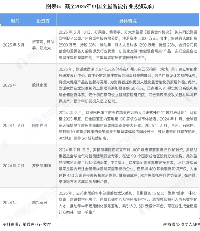 全屋智能产业代表性企业主要投资动向