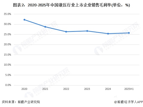 从图表来看,2020 - 2024 年,中国液压行业上市企业平均销售毛利率整体呈下降态势,从 2020 年的 32.3% 逐步下滑,2024 年降至 25.4%;2025 年上半年,毛利率略有回升,达到 25.7%。液压行业既面临着市场竞争加剧、原材料价格波动等挑战,导致成本控制压力大,影响毛利率下行;同时,随着高端液压产品国产替代进程推进,部分企业技术优势凸显,产品附加值提升,这也为毛利率的企稳回升提供了支撑。