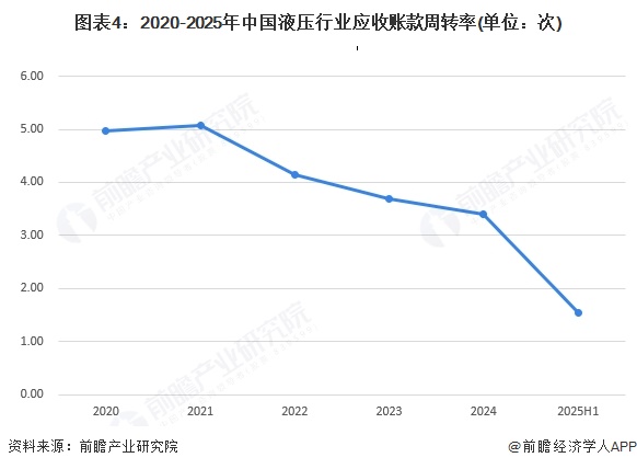 2020-2023年,中国液压行业上市企业平均存货周转率整体呈缓慢下降后平稳的态势,从2020年的3.39次,逐步降至2022年的3.00次,2023年维持在3.00次;2024年有所回升,达到3.13次,但2025年上半年大幅下降至1.47次。结合行业实际,前期行业在市场需求、供应链管理等因素作用下,存货周转保持相对稳定,2024年的回升或与企业优化库存管理、市场需求短期释放有关。