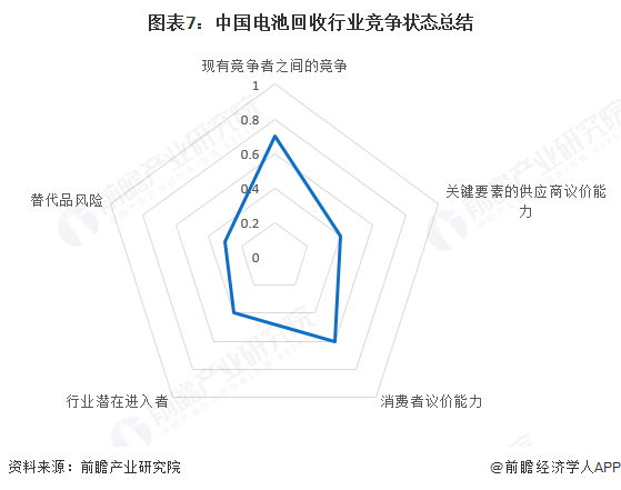 根据以上分析,对各方面的竞争情况进行量化,1代表最大,0代表最小,目前我国电池回收行业五力竞争总结如下: