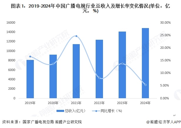 从行业实际收入情况来看,2020-2024年我国广播电视行业总收入保持持续增长态势,但增速随市场基数扩大逐步放缓。2024年,包含广播电视与网络视听全产业链的行业总收入突破1.48万亿元,较2023年实现平稳增长,其中网络视听领域贡献核心增量,行业“线上化”转型成效进一步凸显。