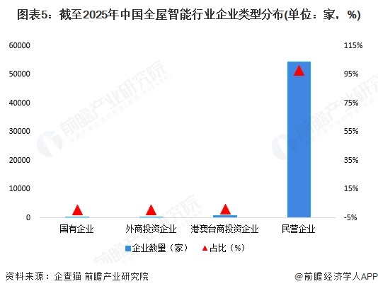 根据企查猫查询数据显示,截至2025年10月,我国全屋智能行业民营企业数量最多,共有5.4万家,占比达97.6%。国有企业、外商投资企业、港澳台商投资企业数量分别为305家、323家、684家。总体上看,民营企业是我国全屋智能行业发展中最鲜活的血液,此外国有企业的数量同样较多。