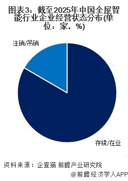 根据企查猫查询数据显示,从注册企业经营状态来看,截至2025年10月,中国全屋智能行业的存续/在业企业6.1万家,占总企业数83%;注销/吊销企业数量约1.2万家,占总企业数的17%。总体上看,中国全屋智能行业企业经营情况良好,在业/存续企业数量占比相对较高。