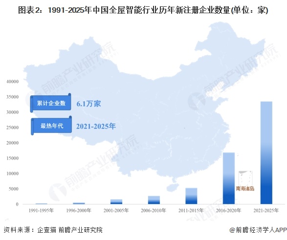 根据企查猫查询数据显示,我国全屋智能行业历年新注册企业数量整体呈增长趋势。截至2025年10月,中国全屋智能行业累计存续/在业注册企业约6.1万家,2021-2025年新增企业数量较高,该区间内新增企业超过3.3万家。整体来看,全屋智能产业整体处于快速上升期。