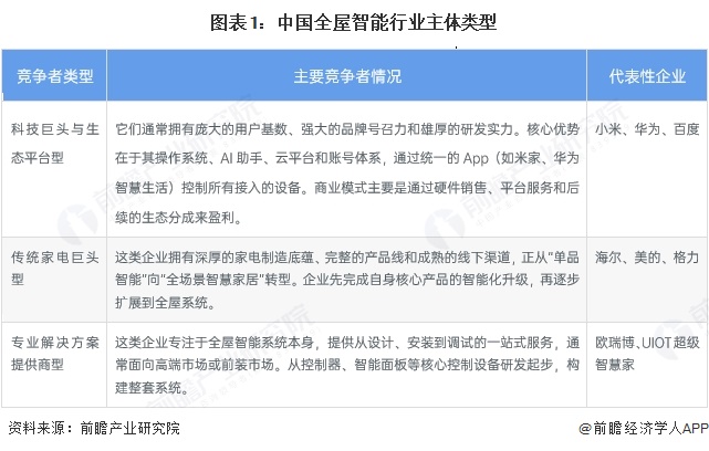 中国全屋智能行业形成三大主体竞争类型,科技巨头与生态平台型企业凭借庞大用户基数、研发实力及统一 App 与生态体系,以硬件销售、平台服务等盈利;传统家电巨头依托制造底蕴、完整产品线与线下渠道,从单品智能向全场景智慧家居转型;专业解决方案提供商聚焦全屋智能系统,面向高端或前装市场提供设计、安装等一站式服务,三类企业共同构成行业多元竞争格局。
