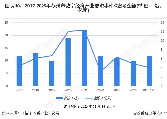 从2017至2025年的融资数据来看,苏州数字经济产业融资规模在2020-2021年达到阶段性顶峰,其中2021年融资事件数最高,2020年融资总额峰值略高于2021年,此后市场活跃度与融资规模出现明显回调并逐步趋于稳定,近四年年度融资总额维持在3-7亿元的区间内。