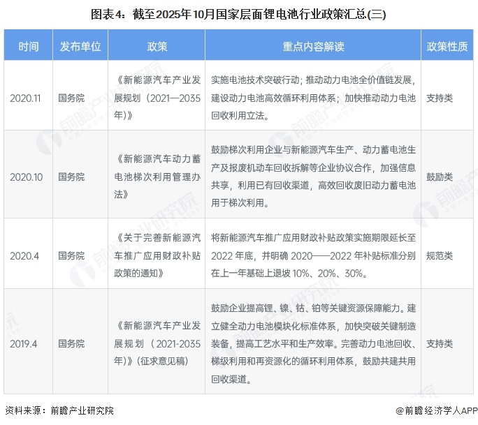 从政策发展历程来看,锂电池政策发展主要经历了三个阶段。第一阶段(2016-2018年):政策驱动产能扩张与技术奠基。国家级政策以补贴为核心,通过《节能与新能源汽车产业发展规划(2012-2020年)》和《促进汽车动力电池产业发展行动方案》推动动力电池能量密度提升,2016年明确三元锂电池补贴标准,刺激车企与电池企业加速产能布局。此阶段政策特征为规模导向,注重快速扩大产能和市场渗透率,但也隐含低端重复建设风险。第二阶段(2019-2020年):补贴退坡倒逼技术升级与结构优化。国家逐步降低新能源汽车补贴强度,根据《战略性新兴产业分类(2018)》,锂离子电池及相关原材料制造、新能源汽车用锂电池制造等均被列入战略性新兴产业新材料行业重点产品和服务,成为锂电池行业产品发展的重点方向。第三阶段(2021-2024年):碳中和目标引领高质量发展与生态重构。国家级政策聚焦绿色制造、回收体系建设和全球化布局,2021年修订《锂离子电池行业规范条件》,提出碳排放强度要求;2024年发布《新能源汽车废旧动力电池综合利用行业规范条件(2024年本)》,要求企业建立回收网络。此阶段政策特征为全产业链治理,注重技术创新、资源循环与国际竞争力提升,推动行业从规模扩张向质量效益型转变。