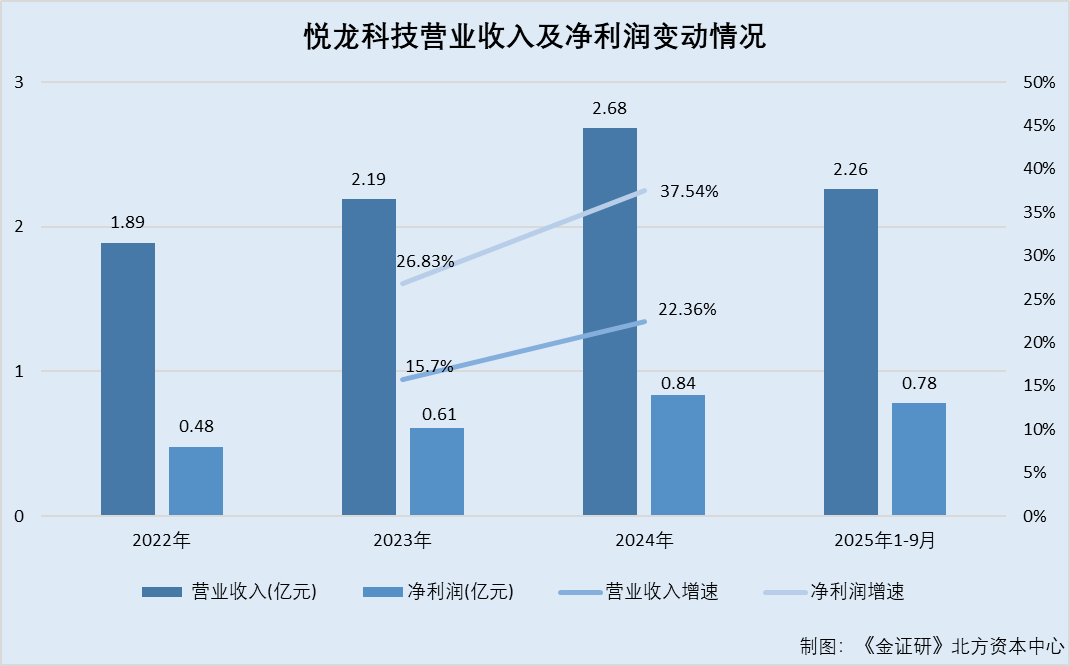 据悦龙科技签署于2025年12月4日的招股说明书(以下简称“签署于2025年12月4日的招股书”),2022-2024年及2025年1-6月,悦龙科技的营业收入分别为1.89亿元、2.19亿元、2.68亿元、1.53亿元,净利润分别为4,792.34万元、6,078.17万元、8,359.71万元、5,302.19万元。