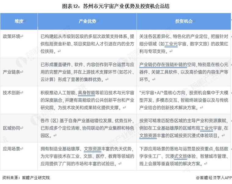 苏州市元宇宙产业拥有从完善政策体系、完整产业链到清晰区域分工的系统性优势:一方面已构建起覆盖硬件、平台到应用的完整产业生态,并与人工智能等技术深度融合,在工业、文旅等丰富场景中奠定坚实基础;另一方面,各区域错位发展形成协同格局。未来投资可重点关注产业链关键环节的强链补链、元宇宙与AI等技术的融合创新,以及匹配区域定位的垂直领域应用落地与运营。