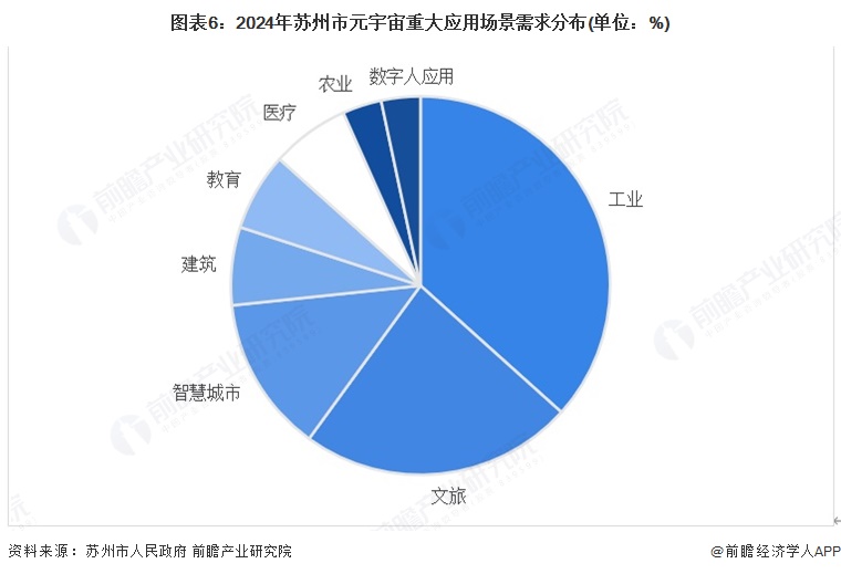 2024年苏州市发布的30项元宇宙重大应用场景需求呈现出以工业领域为核心(占比超三分之一),并向智慧城市、文旅、医疗、教育等多领域拓展的显著特征。其中,工业元宇宙聚焦数字孪生工厂、设备虚拟验证等智能制造环节;文旅元宇宙深度挖掘本地文化IP,开发沉浸式体验项目;整体布局清晰体现了“元宇宙+”战略,旨在通过技术赋能实体经济与城市治理,构建虚实融合的产业创新生态。